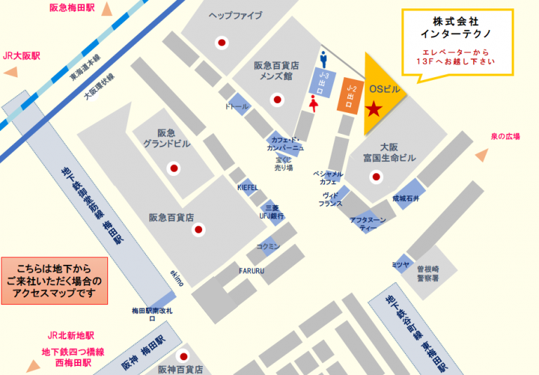 ホワイティ梅田の「J-2出口」を出るとそのままOSビルに入れますので、