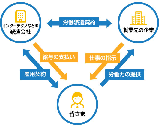 皆さまがインターテクノなどの派遣会社と雇用契約を結んだ上で、就業先の企業で仕事の指示を受けて勤務する働き方です。