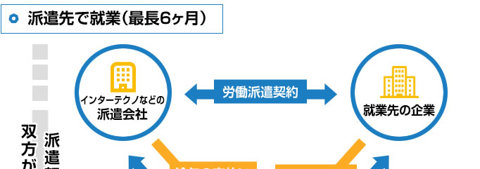 皆さまと就業先の企業との間で直接雇用契約を結ぶのではなく、派遣会社との間で雇用契約を結び、その上で就業先の企業にて働いていただきます。就業条件のご案内、給与の支払い、福利厚生、スキルアップ研修等は派遣会社がサポートします。